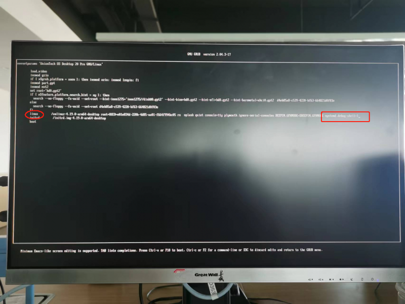 在以linux开头所在行的最后输入systemd.debug-shell=1,按F10进入修复系统。